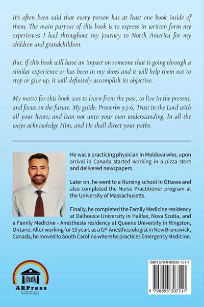 It's often been said that every person has at least one book inside of them. The main purpose of this book is to express in written form my experiences I had throughout my journey to North America for my children and grandchildren. But, if this book will have an impact on someone that is going through a similar experience or has been in my shoes and it will help them not to stop or give up, it will definitely accomplish its objective. My motto for this book was to learn from the past, to live in the present, and focus on the future. My guide: Proverbs 3:5-6; Trust in the Lord with all your heart; and lean not unto your own understanding. In all the ways acknowledge Him, and He shall direct your paths.