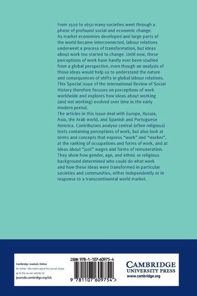 From 1500 to 1650 many societies underwent profound social and economic change. As market economies developed and regions became interconnected, labour relations were transformed alongside ideas about work. Until now, these perceptions of work have rarely been studied from a global perspective, even though their analysis would help us to understand the nature and consequences of shifts in global labour relations. This volume focuses on perceptions of work world-wide and explores how ideas about working (and not working) evolved over time in the early modern period. Contributions analyse central texts containing perceptions of work, terms and concepts that express 'work', the ranking of occupations, and ideas about 'just' wages and forms of remuneration. They show, too, how gender, age, and ethnic or religious background determined who could do what work and how these ideas were transformed in particular societies and communities, either independently or in response to a transcontinental market.