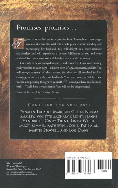 There is incredible joy in a promise kept. Throughout these pages you will discover the vital role a wife plays in understanding and encouraging her husband. You will delight in a more intimate relationship and will experience a deeper fulfillment as you and your husband keep your vows to God, family, church, and community. Get ready to be encouraged, inspired, and convicted. These writers bring godly wisdom to each page; wisdom born of age, experience, and life. You will recognize many of their names, for they are all involved in life-changing ministries with their husbands. You have been touched by these women and possibly thought to yourself, "If I could just have an afternoon with" Well, here is your chance. You will not be disappointed. From the introduction by Denalyn Lucado.