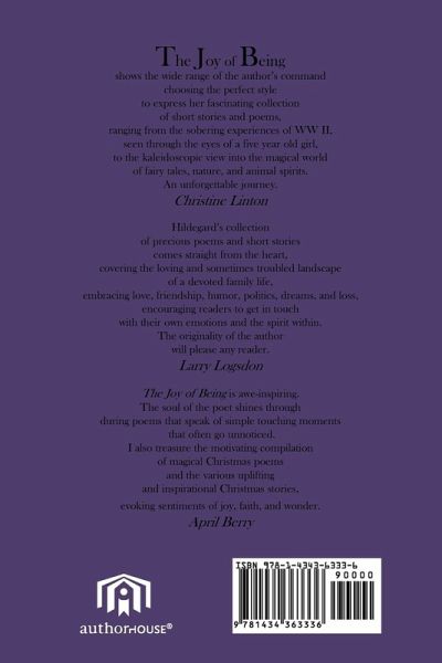 The Joy Of Being is a collection of short stories and poems, ranging from the sobering experiences of WW II, seen through the eyes of a five year old girl, to the kaleidoscopic view into the magical world of fairy tales, nature, and aimal spirits. The poems and also the short stories cover a loving and sometimes troubled landscape of a devoted family life, embracing love, friendship, humor, politics, dreams and loss, encouraging readers to get in touch with their own emotions and the spirit within, involving poems that speak of simple moments that often go unnoticed. Included is also a diverse compilation of Christmas poems and various uplifting and inspirational Christmas stories.