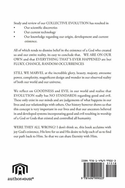 Study and review of our COLLECTIVE EVOLUTION has resulted in ¿ Our scientific discoveries ¿ Our current technology ¿ Our knowledge regarding our origin, development and current existence. All of which tends to dismiss belief in the existence of a God who created us and our entire reality, its easy to conclude that. WE ARE ON OUR OWN and that EVERYTHING THAT'S EVER HAPPENED are but FLUKY, CHANCE, RANDOM OCCURRENCES STILL WE MARVEL at the incredible glory, beauty, majesty, awesome power, complexity, magnificent design and wonder in our observed reality of both our world and our universe. We reflect on GOODNESS and EVIL in our world and realise that EVOLUTION really has NO STANDARDS regarding good and evil. These only exist in our minds and are judgements of what happens in our lives and our relationships with others. Our history however shows us that this concept is very important in our lives and that our ancestors believed in and developed systems incorporating good and evil resulting in worship of a God or Gods that existed and controlled all humanity. WERE THEY ALL WRONG? I don't think so, this book acclaims with joy God's existence, His love for us and His desire to help each of us to find our path back to Him. So that we can share Eternity with Him.