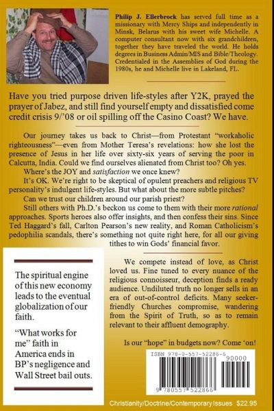 Have you tried purpose driven life-styles after Y2K, prayed the prayer of Jabez, and still find yourself empty and dissatisfied come credit crisis in 9/'08 or oil spilling off the Casino Coast? We have. Our journey takes us back to Christ-from Protestant "workaholic righteousness"-even from Mother Teresa's revelations: how she lost the presence of Jesus in her life over sixty-six years of serving the poor in Calcutta, India. Could we find ourselves alienated from Christ too? Oh yes. Where's the JOY and satisfaction we once knew? Is tithing by Law what God wants? Join us in finding out what Jesus Christ really has to say about trusting in ourselves, America, and easy step "What works for me" theology.