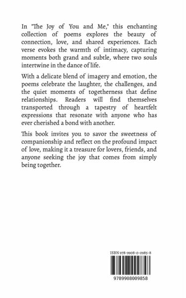 In "The Joy of You and Me," this enchanting collection of poems explores the beauty of connection, love, and shared experiences. Each verse evokes the warmth of intimacy, capturing moments both grand and subtle, where two souls intertwine in the dance of life. With a delicate blend of imagery and emotion, the poems celebrate the laughter, the challenges, and the quiet moments of togetherness that define relationships. Readers will find themselves transported through a tapestry of heartfelt expressions that resonate with anyone who has ever cherished a bond with another. This book invites you to savor the sweetness of companionship and reflect on the profound impact of love, making it a treasure for lovers, friends, and anyone seeking the joy that comes from simply being together.