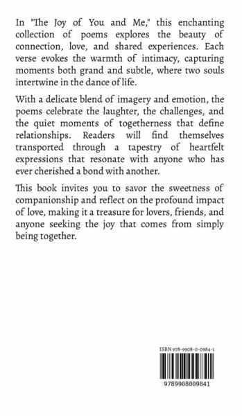 In "The Joy of You and Me," this enchanting collection of poems explores the beauty of connection, love, and shared experiences. Each verse evokes the warmth of intimacy, capturing moments both grand and subtle, where two souls intertwine in the dance of life. With a delicate blend of imagery and emotion, the poems celebrate the laughter, the challenges, and the quiet moments of togetherness that define relationships. Readers will find themselves transported through a tapestry of heartfelt expressions that resonate with anyone who has ever cherished a bond with another. This book invites you to savor the sweetness of companionship and reflect on the profound impact of love, making it a treasure for lovers, friends, and anyone seeking the joy that comes from simply being together.