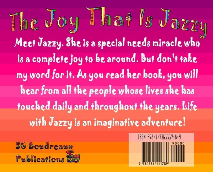 Meet Jazzy. She is a special needs miracle who is a complete joy to be around. But don't take my word for it. As you read her book, you will hear from all the people whose lives she touches daily and throughout the years. Life with Jazzy is an imaginative adventure! Jazzy suffers from a mental health disorder called Encephalopathy, where part of her brain is actually dead. I hope this book helps you to understand more about mental health awareness, and how special people who are different can be. This children's book is designed to help you see how others react to Jasmine. Through our faith and family, she has taught us so much in so many ways. We now see special people with different eyes, and are so much better for it.
