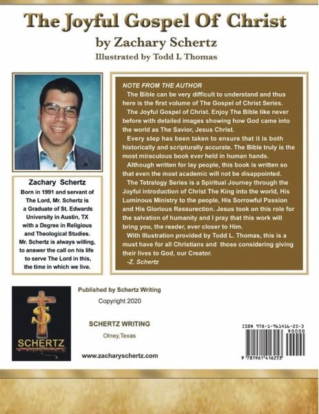 NOTE FROM THE AUTHOR The Bible can be very difficult to understand and thus here is the first volume of the Gospel of Christ Series. The Joyful Gospel of Christ. Enjoy The Bible like never before with detailed images showing how God came into the world as The Savior, Jesus Christ. Every step has been taken to ensure that it is both historically and scripturally accurate. The Bible truly is the most miraculous book ever held in human hands. Although written for lay people, this book is written so that even the most academic will not be disappointed. The Tetralogy Series is a Spiritual Journey through the Joyful introduction of Christ The King into the world, His Luminous Ministry to the people, His Sorrowful Passion and His Glorious Ressurection. Jesus tookn on this role for the salvation of humanity and I pray that this work will bring you, the reader, ever closer to Him. With Illustration provided by Todd L. Thomas, this is a must have for all Christians and those considering giving their lives to God, our Creator. - Z. Schertz