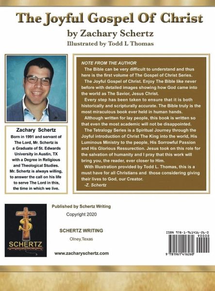 NOTE FROM THE AUTHOR The Bible can be very difficult to understand and thus here is the first volume of the Gospel of Christ Series. The Joyful Gospel of Christ. Enjoy The Bible like never before with detailed images showing how God came into the world as The Savior, Jesus Christ. Every step has been taken to ensure that it is both historically and scripturally accurate. The Bible truly is the most miraculous book ever held in human hands. Although written for lay people, this book is written so that even the most academic will not be disappointed. The Tetralogy Series is a Spiritual Journey through the Joyful introduction of Christ The King into the world, His Luminous Ministry to the people, His Sorrowful Passion and His Glorious Ressurection. Jesus tookn on this role for the salvation of humanity and I pray that this work will bring you, the reader, ever closer to Him. With Illustration provided by Todd L. Thomas, this is a must have for all Christians and those considering giving their lives to God, our Creator. - Z. Schertz