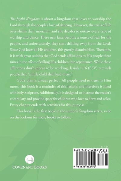 The Joyful Kingdom is about a kingdom that loves to worship the Lord through the people's love of dancing. However, the trials of life overwhelm their monarch, and she decides to outlaw every type of worship and dance. These new laws become a source of fear for the people, and unfortunately, they start drifting away from the Lord. Since God loves all His children, this greatly disturbs Him. Therefore, it is with great sadness that God sends afflictions to His people three times in the effort of calling His children into repentance. While these afflictions don't appear to be working, Isaiah 11:6 (ESV) reminds people that "a little child shall lead them." God's plan is always perfect. All people need to trust in Him more. This book is a reminder of this lesson, and therefore is filled with holy Scripture. Additionally, it is designed to increase the reader's vocabulary and provide space for children who love to draw and color. Every chapter ends with activities for this purpose. This book is the first book in the author's Kingdom series, so be on the lookout for more books to follow.