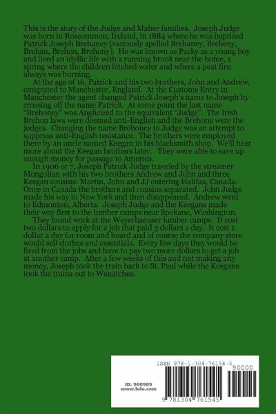 This is the story of the Judge and Maher families. Joseph Judge was born in Roscommon, Ireland, in 1884 where he was baptized Patrick Joseph Brehaney [variously spelled Brehaney, Breheny, Brehan, Brehon, Brehony]. He was known as Packy as a young boy and lived an idyllic life with a running brook near the home, a spring where the children fetched water and where a peat fire always was burning.