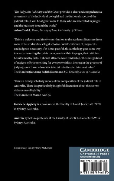 This book is for lawyers, judges, academics, and anyone interested in the contemporary state of the Australian judiciary. Through the lenses of judicial leadership, diversity, collegiality, dissent, style, technology, the media and popular culture, it analyses how judges work individually and as a collective to protect and promote judicial values.