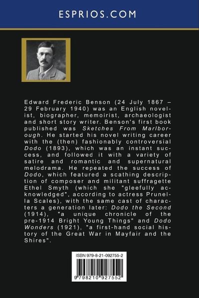 Edward Frederic Benson (24 July 1867 - 29 February 1940) was an English novelist, biographer, memoirist, archaeologist and short story writer. Benson's first book published was Sketches From Marlborough. He started his novel writing career with the (then) fashionably controversial Dodo (1893), which was an instant success, and followed it with a variety of satire and romantic and supernatural melodrama. He repeated the success of Dodo, which featured a scathing description of composer and militant suffragette Ethel Smyth (which she "gleefully acknowledged", according to actress Prunella Scales), with the same cast of characters a generation later: Dodo the Second (1914), "a unique chronicle of the pre-1914 Bright Young Things" and Dodo Wonders (1921), "a first-hand social history of the Great War in Mayfair and the Shires".