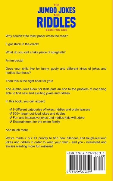 Why couldn't the toilet paper cross the road? It got stuck in the crack! What do you call a fake piece of spaghetti? an im-pasta! Does your child live for funny, goofy and different kinds of jokes and riddles like these? Then keep on reading.... We know riddles and jokes are some of the best ways to pass time and bond with friends and family. We also know that they have numerous health benefits that can positively affect you and your child in many ways! When is comes riddles and jokes, they have been around since the dawn of time and continuously bring joy to all different types of people around the world to this very day. Unfortunately, finding interesting and intriguing riddles, puzzles and brain teasers can take a lot of time and effort to find when searching through blog post after blog post. Luckily, The Jumbo Joke Book for Kids puts an end to this problem, putting all of the most hilarious and laugh-out-loud jokes we could possibly find into one, convenient place. In this book, you can expect: 9 different categories of riddles and brain teasers 500+ laugh-out-loud jokes and riddles Jokes that are easy to hear and comprehend Fun and interactive jokes kids will adore Entertainment for the entire family Clear and concise narration for the ultimate experience And much more... Now, we know some types of jokes and riddles books can be repetitive and boring. Seeing the same jokes you always see over and over again is no fun at all. We've made it our #1 priority to find new hilarious and laugh-out-loud jokes in order to keep you interested and always wanting more. So, are you ready to laugh out loud and become the funniest person around? Then scroll up and click the "Add to Cart" button now!