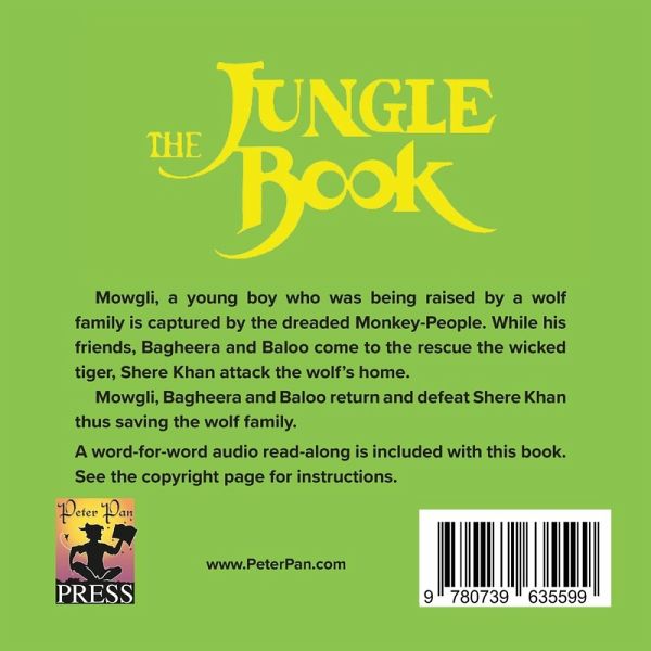In this version of The Jungle Book, a young boy named Mowgli is raised by a wolf pack in the jungle after his parents fall prey to the fierce tiger, Shere Khan. With the guidance of Baloo, a bear, and Bagheera, a panther, Mowgli learns the ways of the jungle. After a series of adventures, including being kidnapped by the mischievous monkeys, Mowgli befriends the snake Kaa and returns home to confront Shere Khan. Using a knife gifted by Kaa, Mowgli defeats the tiger, saving the wolf pack and solidifying his place in the jungle. A word-for-word audio read-along is included with this book. See the copyright page for instructions.