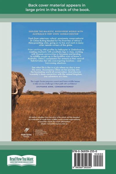 Explore the majestic, biodiverse world with Australia's very own 'jungle doctor'. Fresh from veterinary school, passionate conservationist Dr Chloe Buiting headed for the front line of Africa's rhino-poaching crisis, going on to live and work in many other remote corners of the globe. From catching wild giraffes by helicopter in Zimbabwe to meeting elephants with prosthetic legs in Asia, working with Maasai communities in Tanzania and tending to wildlife caught up in the bushfire crisis at home in Australia, Chloe's compassion for animals in their natural habitat takes her into awe-inspiring locations - and hair-raising situations. See what life is like in a job where no day is ever the same. Accompany Chloe on her journey into the fascinating world of conservation. And discover humanity's deep connection with the animal kingdom, one adventure at a time. 'The Jungle Doctor prepares current and future wildlife heroes to take on any challenge in their path with confidence' Stephanie Arne, Conservationist