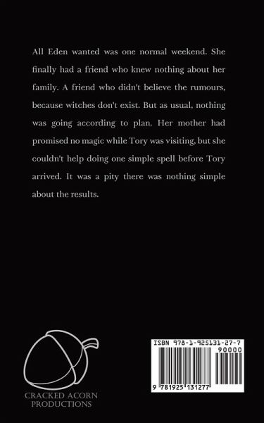 Genre: Young Adult Urban Fantasy. All Eden wanted was one normal weekend. She finally had a friend who knew nothing about her family. A friend who didn't believe the rumours, because witches don't exist. But as usual, nothing was going according to plan. Her mother had promised no magic while Tory was visiting, but she couldn't help doing one simple spell before Tory arrived. It was a pity there was nothing simple about the results. This story was written by an Australian author using Australian spelling.