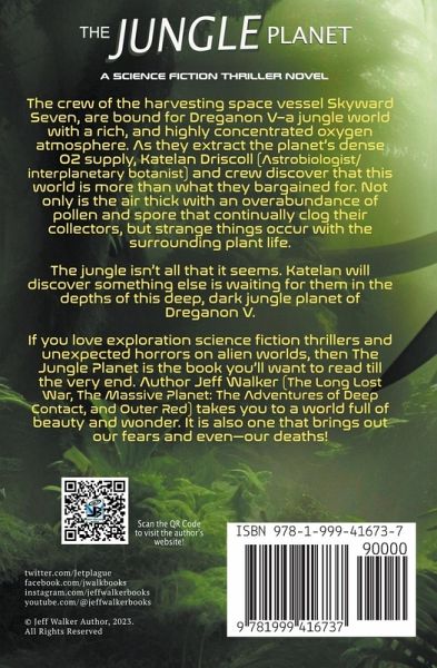The crew of the harvesting space vessel Skyward Seven, are bound for Dreganon V––a jungle world with a rich, and highly concentrated oxygen atmosphere. As they extract the planet's dense O2 supply, Katelan Driscoll (Astrobiologist/interplanetary botanist) and crew being to discover that this world is more than what they bargained for. Not only is the air thick with an overabundance of pollen and spore that continually clog their collectors., but strange things occur with the surrounding plant life. The jungle isn't all that it seems. Katelan will discover something else is waiting for them in the depths of this deep, dark jungle planet of Dreganon V. If you love exploration science fiction thrillers and unexpected horrors on alien worlds, then The Jungle Planet is the book you'll want to read till the very end. Author Jeff Walker (The Long Lost War, The Massive Planet: The Adventures of Deep Contact, and Outer Red) takes you to a world full of beauty and wonder. It is also one that brings out our fears and even—our deaths!