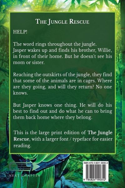 HELP! The word rings throughout the jungle. Jasper wakes up and finds his brother, Willie, in front of their home. But he doesn't see his mom or sister. Reaching the outskirts of the jungle, they find that some of the animals are in cages. Where are they going, and will they return? No one knows. But Jasper knows one thing. He will do his best to find out and do what he can to bring them back home where they belong. This is the large print edition of The Jungle Rescue, with a larger font / typeface for easier reading.