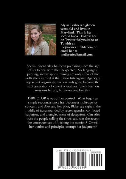 Special Agent Alex has been preparing since the age of six to deal with the unexpected. Six languages, piloting, and weapons training are only a few of the skills she's learned at the Junior Intelligence Agency, a top secret organization where kids go to become the next generation of covert operatives. She's been on missions before, but never one like this. DIRECTOR is out of her control. What began as simple reconnaissance has become a multi-agency concern, and Alex and her pilot, Blake, are right in the middle of it, surrounded by secret agendas, conflicted superiors, and a tangled mess of deception. Can Alex trust the people calling the shots, and can she accept the consequences of finishing the mission? Or will her doubts and principles corrupt her judgment?