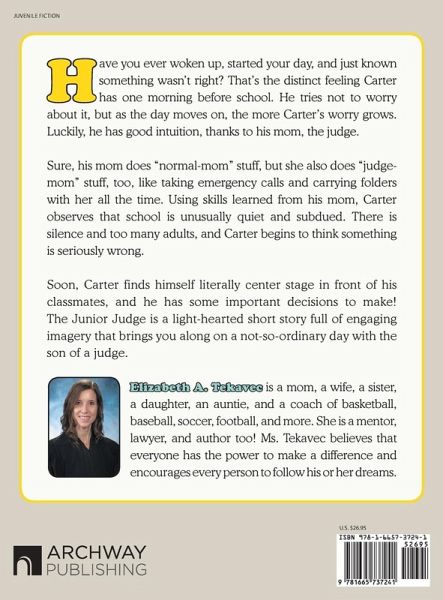Have you ever woken up, started your day, and just known something wasn't right? That's the distinct feeling Carter has one morning before school. He tries not to worry about it, but as the day moves on, the more Carter's worry grows. Luckily, he has good intuition, thanks to his mom, the judge. Sure, his mom does "normal-mom" stuff, but she also does "judge-mom" stuff, too, like taking emergency calls and carrying folders with her all the time. Using skills learned from his mom, Carter observes that school is unusually quiet and subdued. There is silence and too many adults, and Carter begins to think something is seriously wrong. Soon, Carter finds himself literally center stage in front of his classmates, and he has some important decisions to make! The Junior Judge is a light-hearted short story full of engaging imagery that brings you along on a not-so-ordinary day with the son of a judge.