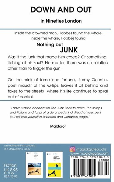 Inside the drowned man, Hobbes found the whale. Inside the whale, Hobbes found nothing but junk. *** Among the cardboard boxes and bin-liners, outside a restaurant called perplexingly Le Chat Noir, someone had dumped a manikin, which appeared to have been super-glued with angel wings. A large black dog or possibly werewolf springs and snaps off its head. In the ghoulish celebration of the dismemberment of the manikin there is in fact no blood, just the crunching of prosthetic limbs. Here in the junkyard it is often like this - moments of violence and high strangeness, followed by hours of what seems futile wandering. *** Was it the junk that made him creep? Or something itching at his soul? No matter, there was no solution other than to trigger the gun. - On the brink of fame and fortune, Jimmy Quentin, poet maudit of the Q-tips, leaves it all behind and takes to the streets where his life continues to spiral out of control.