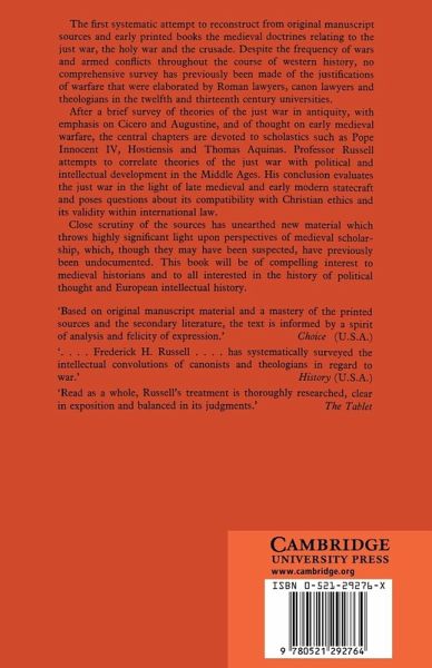 The first systematic attempt to reconstruct from original manuscript sources and early printed books the medieval doctrines relating to the just war, the holy war and the crusade. Despite the frequency of wars and armed conflicts throughout the course of western history, no comprehensive survey has previously been made of the justifications of warfare that were elaborated by Roman lawyers, canon lawyers and theologians in the twelfth and thirteenth century universities. After a brief survey of theories of the just war in antiquity, with emphasis on Cicero and Augustine, and of thought on early medieval warfare, the central chapters are devoted to scholastics such as Pope Innocent IV, Hostiensis and Thomas Aquinas. Professor Russell attempts to correlate theories of the just war with political and intellectual development in the Middle Ages. His conclusion evaluates the just war in the light of late medieval and early modern statecraft and poses questions about its compatibility with Christian ethics and its validity within international law.