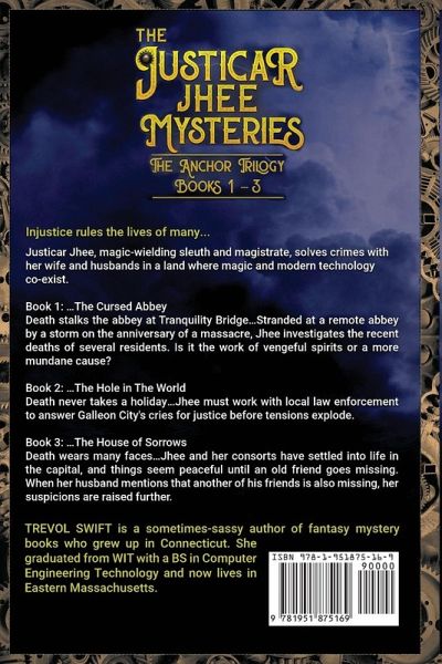 Injustice rules the lives of many... Justicar Jhee, magic-wielding sleuth and magistrate, solves crimes with her wife and husbands in a land where magic and modern technology co-exist. Book 1: ...The Cursed Abbey Death stalks the abbey at Tranquility Bridge...Stranded at a remote abbey by a storm on the anniversary of a massacre, Jhee investigates the recent deaths of several residents. Is it the work of vengeful spirits or a more mundane cause? Book 2: ...The Hole in The World Death never takes a holiday...Jhee must work with local law enforcement to answer Galleon City's cries for justice before tensions explode. Book 3: ...The House of Sorrows Death wears many faces...Jhee and her consorts have settled into life in the capital, and things seem peaceful until an old friend goes missing. When her husband mentions that another of his friends is also missing, her suspicions are raised further.