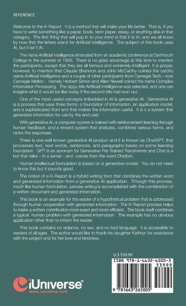 Welcome to the K-Report. It is a method that will make your life better. That is, if you have to write something like a paper, book, term paper, essay, or anything else in that category. The first thing that will pop in to your mind is that it is AI, and we all know by now that the letters stand for Artificial Intelligence. The subject of this book uses AI, but it isn't AI. The name Artificial Intelligence emanated from an academic conference at Dartmouth College in the summer of 1956. There is no great advantage at this time to mention the participants, except that they are all famous and extremely intelligent. It is proper, however, to mention that Claude Shannon and John McCarthy coined the catchy name Artificial Intelligence and a couple of other participants from Carnegie Tech - now Carnegie Mellon - namely Herbert Simon and Allen Newell coined the name Complex Information Processing. The zippy title Artificial Intelligence was selected, and one can imagine what it would be like today if the second title had won out. One of the most useful concepts imbedded in AI is generative AI. Generative AI is a process that uses three forms: a foundation of information, an application model, and a sophisticated front end that makes the information useful. It is s a system that generates information for use by the end user. With generative AI, a computer system is trained with reinforcement learning through human feedback, and a reward system that analyzes, combines various forms, and ranks the responses. There is one well known generative AI product and it is known as ChatGPT, that processes text, next words, sentences, and paragraphs bases on some learning foundation. GPT is an acronym for Generative Pre-Trained Transformer and Chat is a bot that talks - in a sense - and comes from the word Chatbot. Human intellectual formulation is based on a generative model. You do not need to know this but it sounds good. The notion of a K-Report is a hybrid writing form that combines the written word and generated information from a generative AI application. Through this process, much like human formulation, precise writing is accomplished with the combination of a written document and generated information. This book is an example for the reader of a hypothetical problem that is addressed through human cooperation with generated information. The K-Report process helps to make a written contribution more exact and more efficient. The book itself combines a typical human problem with generated information. The example has no obvious application other than to inform the reader. This book contains no violence, no sex, and no bad language. It is accessible to readers of all ages. The author would like to thank his daughter Kathryn for assistance with the project and for her love and kindness.