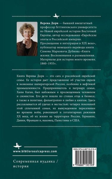 ENG The book is a family saga, presenting an insight into the history of Jews in Russia's oil industry. It leads to forced migration in the turbulent 20th century endured and mastered by a cohesive family over four generations in Russia, Germany, Denmark, France, Palestine, and the United States of America. RUS Книга Верены Дорн - это сага о российской еврейской семье. Ее история дает представление об участии евреев в экономике императорской России, особенно в нефтяной промышленности. Предприниматель и патриарх семьи, Хаим Каган, был набожным и просвещенным человеком и сионистом. Его дети пошли по его стопам в бизнесе, а также в политике, филантропии и любви к книгам. Здесь рассказывается об их вынуж