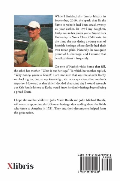 On one of Kathy's visits home that fall, she asked her mother, "What is our heritage?" To which her mother replied, "Why honey, you're a Texan!" I am not sure that was the answer Kathy was looking for, but, to my knowledge, she never questioned her mother's response. However, at that time I decided that some day I would research our Kale Family history so Kathy would know her family heritage beyond being a proud Texan. I hope she and her children, Julia Marie Routh and John Michael Routh, will come to appreciate their German heritage after reading about the Kehls who came to America in 1731. They and their descendents helped form this great nation.