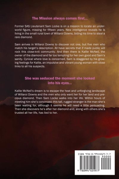 Former SAS Lieutenant Sam Locke is on a mission to locate an underworld figure, missing for fifteen years. New intelligence reveals he is living in the small rural town of Willaroi Downs, biding his time to steal a rare diamond. Sam arrives in Willaroi Downs to discover not one, but five men who match his target's description. All have secrets that if made public will rock this close-knit community. And then there is Kallie McNeil, the owner of the diamond and far too tempting for her own good and Sam's sanity. Cynical where love is concerned, Sam is staggered by his growing feelings for Kallie, an impulsive and vibrant young woman with close links to all his suspects. Kallie McNeil's dream is to escape the heat and unforgiving landscape of Willaroi Downs and the men who only want her for her land and precious diamond. Then Sam Locke walks into her life. Within hours of meeting him she's convinced; this tall, rugged stranger is the man she's been waiting for, although it seems he will need a little persuading. Then she discovers he's after her diamond and, along with others she's trusted all her life, has lied to her.