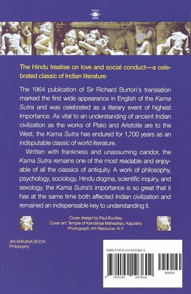 The 1964 publication of Sir Richard Burton's translation marked the first wide appearance in English of the Kama Sutra and was celebrated as a literary event of highest importance. As vital to an understanding of ancient Indian civilization as the works of Plato and Aristotle are to the West, the Kama Sutra has endured for 1,700 years as an indisputable classic of world literature. Written with frankness and unassuming candor, the Kama Sutra remains one of the most readable and enjoyable of all the classics of antiquity. A work of philosophy, psychology, sociology, Hindu dogma, scientific inquiry, and sexology, the Kama Sutra's importance is so great that it has at the same time both affected Indian civilization and remained an indispensable key to understanding it.