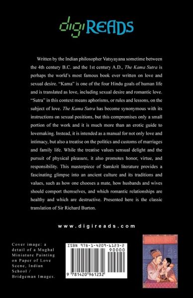 Written by the Indian philosopher Vatsyayana sometime between the 4th century B.C. and the 1st century A.D., "The Kama Sutra" is perhaps the world’s most famous book ever written on love and sexual desire. "Kama" is one of the four Hindu goals of human life and is translated as love, including sexual desire and romantic love. "Sutra" in this context means aphorisms, or rules and lessons, on the subject of love. "The Kama Sutra" has become synonymous with its instructions on sexual positions, but this compromises only a small portion of the work and it is much more than an erotic guide to lovemaking. Instead, it is intended as a manual for not only love and intimacy, but also a treatise on the politics and customs of marriages and family life. While the treatise values sensual delight and the pursuit of physical pleasure, it also promotes honor, virtue, and responsibility. This masterpiece of Sanskrit literature provides a fascinating glimpse into an ancient culture and its traditions and values, such as how one chooses a mate, how husbands and wives should comport themselves, and which romantic relationships are healthy and which are destructive. Presented here is the classic translation of Sir Richard Burton printed on premium acid-free paper.