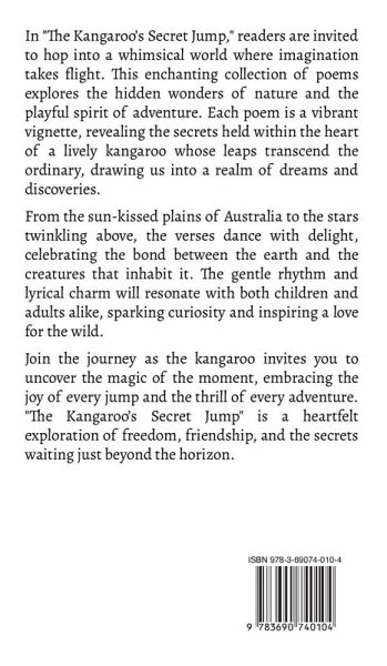 In "The Kangaroo's Secret Jump," readers are invited to hop into a whimsical world where imagination takes flight. This enchanting collection of poems explores the hidden wonders of nature and the playful spirit of adventure. Each poem is a vibrant vignette, revealing the secrets held within the heart of a lively kangaroo whose leaps transcend the ordinary, drawing us into a realm of dreams and discoveries. From the sun-kissed plains of Australia to the stars twinkling above, the verses dance with delight, celebrating the bond between the earth and the creatures that inhabit it. The gentle rhythm and lyrical charm will resonate with both children and adults alike, sparking curiosity and inspiring a love for the wild. Join the journey as the kangaroo invites you to uncover the magic of the moment, embracing the joy of every jump and the thrill of every adventure. "The Kangaroo's Secret Jump" is a heartfelt exploration of freedom, friendship, and the secrets waiting just beyond the horizon.