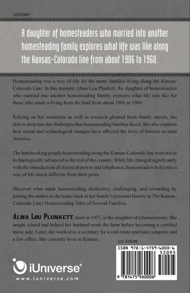 Homesteading was a way of life for the many families living along the Kansas/Colorado Line. In this memoir, Alma Lou Plunkett, the daughter of homesteaders who married into another homesteading family, explores what life was like for those who made a living from the land from about 1906 to 1960. Relying on her memories as well as research gleaned from family stories, she delves deep into the challenges that homesteading families faced. She also explains how social and technological changes have affected the lives of farmers in rural America. The hardworking people homesteading along the Kansas-Colorado line were not as technologically advanced as the rest of the country. While life changed significantly with the introduction of electrical power and telephones, homesteaders hold onto a way of life much different from their peers. Discover what made homesteading distinctive, challenging, and rewarding by joining the author as she looks back at her family's personal history in The Kansas-Colorado Line: Homesteading Tales of Several Families.