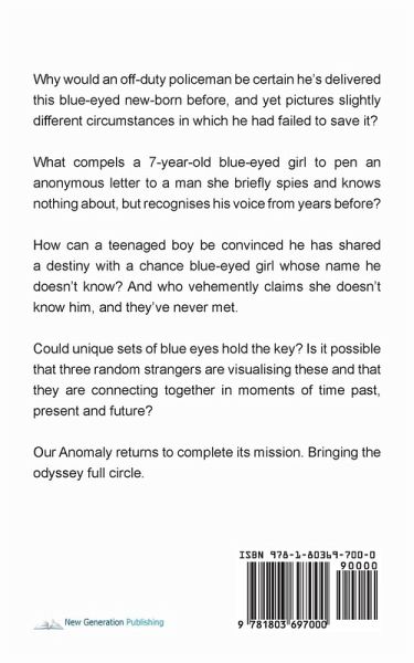 Why would an off-duty policeman be certain he's delivered this blue-eyed new-born before, and yet pictures slightly different circumstances in which he had failed to save it? What compels a 7-year-old blue-eyed girl to pen an anonymous letter to a man she briefly spies and knows nothing about, but recognises his voice from years before? How can a teenaged boy be convinced he has shared a destiny with a chance blue-eyed girl whose name he doesn't know? And who vehemently claims she doesn't know him, and they've never met. Could unique sets of blue eyes hold the key? Is it possible that three random strangers are visualising these and that they are connecting together in moments of time past, present and future? Our Anomaly returns to complete its mission. Bringing the odyssey full circle.