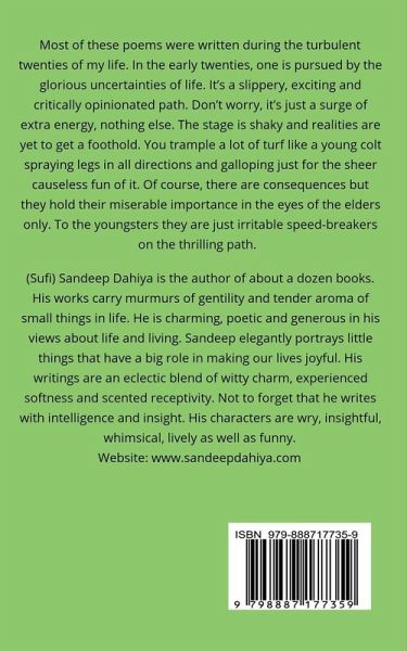 Most of these poems were written during the turbulent twenties of my life. In the early twenties, one is pursued by the glorious uncertainties of life. It’s a slippery, exciting and critically opinionated path. Don’t worry, it’s just a surge of extra energy, nothing else. The stage is shaky and realities are yet to get a foothold. You trample a lot of turf like a young colt spraying legs in all directions and galloping just for the sheer causeless fun of it. Of course, there are consequences but they hold their miserable importance in the eyes of the elders only. To the youngsters they are just irritable speed-breakers on the thrilling path. One’s hormonally buzzing self floats in a hazy mist of unripe, raw, juicy, sweet-sour tart of dreams and imaginations striking the moron mass of established norms. The hormonal-storms-fuelled beliefs, views, opinions and dreams create sparks and sometimes thunderstorms. Nothing wrong with that! That’s all part of our making. It’s a pretty noisy and shaky groundwork born of your ‘making’ that provides a bit of stability later in life. Ask anyone, most of us are very lenient and forgiving towards our youthful gallops even if these have given us many bruises after the hard falls. We wear them with pride like the symbols of our reaching the peak of the mountain.
