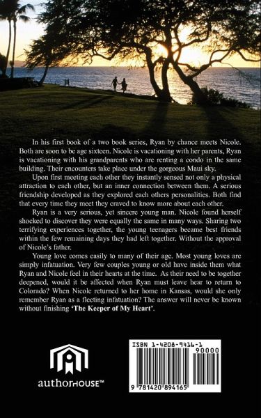 In his first book of a two book series, Ryan by chance meets Nicole. Both are soon to be age sixteen. Nicole is vacationing with her parents, Ryan is vacationing with his grandparents who are renting a condo in the same building. Their encounters take place under the gorgeous Maui sky. Upon first meeting each other they instantly sensed not only a physical attraction to each other, but an inner connection between them. A serious friendship developed as they explored each others personalities. Both find that every time they meet they craved to know more about each other. Ryan is a very serious, yet sincere young man. Nicole found herself shocked to discover they were equally the same in many ways. Sharing two terrifying experiences together, the young teenagers became best friends within the few remaining days they had left together. Without the approval of Nicole's father. Young love comes easily to many of their age. Most young loves are simply infatuation. Very few couples young or old have inside them what Ryan and Nicole feel in their hearts at the time. As their need to be together deepened, would it be affected when Ryan must leave hear to return to Colorado? When Nicole returned to her home in Kansas, would she only remember Ryan as a fleeting infatuation? The answer will never be known without finishing 'The Keeper of My Heart'.