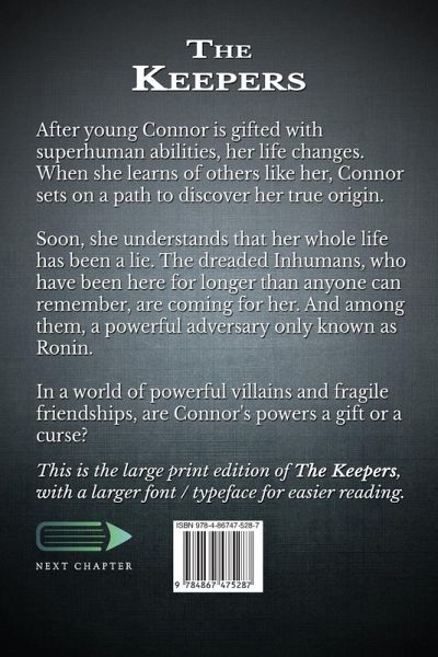 After young Connor is gifted with superhuman abilities, her life changes. When she learns of others like her, Connor sets on a path to discover her true origin. Soon, she understands that her whole life has been a lie. The dreaded Inhumans, who have been here for longer than anyone can remember, are coming for her. And among them, a powerful adversary only known as Ronin. In a world of powerful villains and fragile friendships, are Connor's powers a gift or a curse? This is the large print edition of The Keepers, with a larger font / typeface for easier reading.