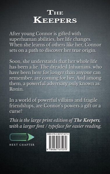After young Connor is gifted with superhuman abilities, her life changes. When she learns of others like her, Connor sets on a path to discover her true origin. Soon, she understands that her whole life has been a lie. The dreaded Inhumans, who have been here for longer than anyone can remember, are coming for her. And among them, a powerful adversary only known as Ronin. In a world of powerful villains and fragile friendships, are Connor's powers a gift or a curse? This is the large print edition of The Keepers, with a larger font / typeface for easier reading.