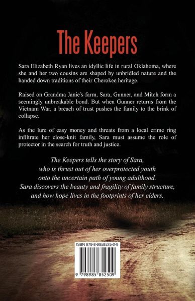 Sara Elizabeth Ryan lives an idyllic life in rural Oklahoma, where she and her two cousins are shaped by unbridled nature and the handed down traditions of their Cherokee heritage. Raised on Grandma Janie's farm, Sara, Gunner, and Mitch form a seemingly unbreakable bond. But when Gunner returns from the Vietnam War, a breach of trust pushes the family to the brink of collapse. As the lure of easy money and threats from a local crime ring infiltrate her close-knit family, Sara must assume the role of protector in the search for truth and justice. The Keepers tells the story of Sara, who is thrust out of her overprotected youth onto the uncertain path of young adulthood. Sara discovers the beauty and fagility of family structure, and how hope lives in the footprints of her elders.