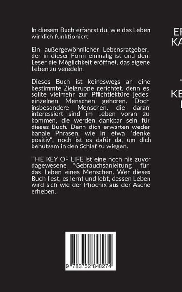 In diesem Buch erfährst du, wie das Leben wirklich funktioniert. Ein außergewöhnlicher Lebensratgeber, der in dieser Form einmalig ist und dem Leser die Möglichkeit eröffnet, das eigene Leben zu veredeln. Dieses Buch ist keineswegs an eine bestimmte Zielgruppe gerichtet, denn es sollte vielmehr zur Pflichtlektüre jedes einzelnen Menschen gehören. Doch insbesondere Menschen, die daran interessiert sind im Leben voran zu kommen, die werden dankbar sein für dieses Buch. Denn dich erwarten weder banale Phrasen, wie in etwa "denke positiv", noch ist es dafür da, um dich behutsam in den Schlaf zu wiegen. THE KEY OF LIFE ist eine noch nie zuvor dagewesene "Gebrauchsanleitung" für das Leben eines Menschen. Wer dieses Buch liest, es lernt und lebt, dessen Leben wird sich wie der Phoenix aus der Asche erheben.