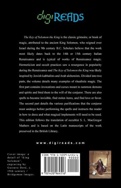 "The Key of Solomon the King" is the classic grimoire, or book of magic, attributed to the ancient King Solomon, who reigned over Israel during the 9th century B.C. Scholars believe that the work most likely dates back to the 14th or 15th century Italian Renaissance and is typical of works of Renaissance magic. Hermeticism and occult practices saw a resurgence in popularity during the Renaissance and "The Key of Solomon the King" was likely inspired by Jewish kabbalists and Arab alchemists. Divided into two parts, the volume details many examples of ritualistic magic. The first part contains invocations and curses meant to summon demons and spirits and bind them to the will of the conjuror. There are also spells to become invisible, find stolen items, and find love or favor. The second part details the various purifications that the conjuror must undergo before performing the spells and instructs the reader in how to dress and what magical implements will need to be used. This edition follows the translation of occultist S. L. MacGregor Mathers and is based on the Latin manuscripts of the work preserved in the British Library. This edition is printed on premium acid-free paper.