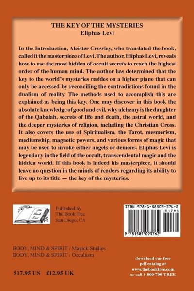 In the Introduction, Aleister Crowley, who translated the book, called it the masterpiece of Levi. The author, Eliphas Levi, reveals how to use the most hidden of occult secrets to reach the highest order of the human mind. The author has determined that the key to the world’s mysteries resides on a higher plane that can only be accessed by reconciling the contradictions found in the dualism of reality. The methods used to accomplish this are explained as being this key. One may discover in this book the absolute knowledge of good and evil, why alchemy is the daughter of the Qabalah, secrets of life and death, the astral world, and the deeper mysteries of religion, including the Christian Cross. It also covers the use of Spiritualism, the Tarot, mesmerism, mediumship, magnetic powers, and various forms of magic that may be used to invoke either angels or demons. Eliphas Levi is legendary in the field of the occult, transcendental magic and the hidden world. If this book is indeed his masterpiece, it should leave no question in the minds of readers regarding its ability to live up to its title — the key of the mysteries.