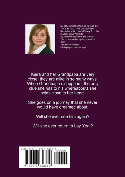 Kiera and her Grandpapa are very close; they are alike in so many ways. When Grandpapa disappears, the only clue she has to his whereabouts she holds close to her heart. She goes on a journey that she never would have dreamed about. Will she ever see him again? Will she ever return to Lay York?