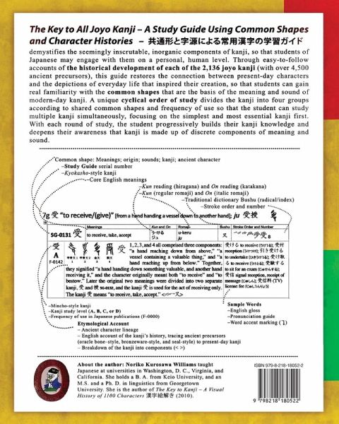 Wherever the same component appears in kanji (Chinese characters used in Japanese), its core meaning and/or sound is the same or closely related to every other kanji with the same component because they were derived from the same origins. This book explains those origins with actual ancient characters and their development into present-day Japanese kanji. All 2,136 Joyo kanji are grouped into 432 common shapes so that the reader can acquire multiple kanji at one time efficiently. In addition to its use as a practical guide, the reader can also gain insight into how ideas were shaped into physical forms in human civilization. Each of the 2,136 Kanji Tables contains the following items: ¿ English core meaning, kun and on reading, traditional bushu ("radical"), full stroke order illustration, and total stroke number ¿ Four suggested levels of kanji study, roughly corresponding to the five levels of the JLPT (Japanese Language Proficiency Test) - Level A (566 kanji) - Beginning level [JLPT N5 and N4]; Level B (525 kanji) - Intermediate through Pre-advanced [JLPT N3 and N4]; Level C (520 kanji) - Advanced I level [JLPT N1]; and Level D (525 kanji) - Advanced II level [JLPT N1] ¿ 4,500 ancient characters (in oracle bone-style¿¿¿, bronzeware-style¿¿, and seal-style¿¿), allowing the reader to visualize and grasp the development of the kanji. ¿ Succinct English accounts linking its origin to present-day Japanese kanji. ¿ Several sample words and an accentual tonal fall marking in standard Japanese. ¿ Four indices: Index 1 The Order of Kanji in the Book (by the Study Guide number) ¿¿¿¿¿¿¿¿; Index 2 Kanji by On and Kun Reading in Japanese Syllabary Order ¿¿¿¿¿¿¿¿¿¿¿¿¿¿; Index 3 Kanji by Total Stroke Number ¿¿¿¿¿¿¿¿¿; and Index 4 Kanji by Bushu ¿¿¿¿¿¿¿¿