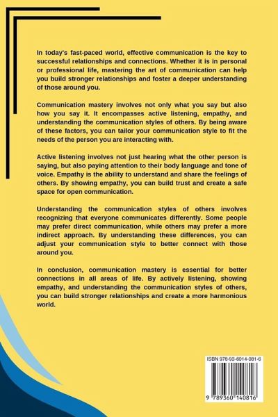 Communication is the key to building and maintaining strong relationships, both personal and professional. When we communicate effectively, we are able to connect with others on a deeper level, build trust, and resolve conflicts peacefully. Communication mastery is not something that happens overnight. It takes time, effort, and practice. But anyone can learn to be a better communicator. Here are some tips for mastering communication: Be clear and concise. Know what you want to say and say it in a way that is easy for others to understand. Avoid using jargon or technical language that your audience may not be familiar with. Be an active listener. Pay attention to what the other person is saying and ask clarifying questions. Don't just wait for your turn to talk. Be empathetic. Try to see things from the other person's perspective and understand their feelings. Be respectful. Even if you disagree with someone, you can still treat them with respect. Avoid making personal attacks or using hurtful language. Be assertive. This means communicating your needs and wants clearly and directly, without being aggressive or passive-aggressive.