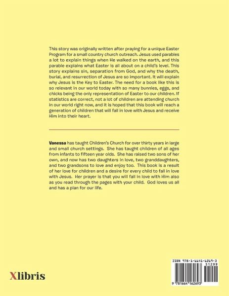 This story was originally written after praying for a unique Easter Program for a small country church outreach. Jesus used parables a lot to explain things when He walked on the earth, and this parable explains what Easter is all about on a child's level. This story explains sin, separation from God, and why the death, burial, and resurrection of Jesus are so important. It will explain why Jesus is the Key to Easter. The need for a book like this is so relevant in our world today with so many bunnies, eggs, and chicks being the only representation of Easter to our children. If statistics are correct, not a lot of children are attending church in our world right now, and it is hoped that this book will reach a generation of children that will fall in love with Jesus and receive Him into their heart.