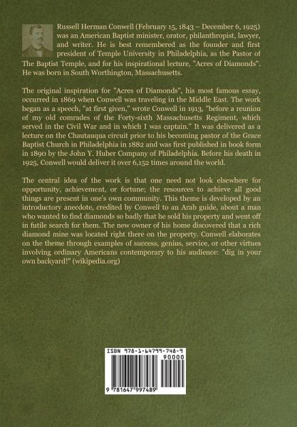 Russell Herman Conwell (February 15, 1843 - December 6, 1925) was an American Baptist minister, orator, philanthropist, lawyer, and writer. He is best remembered as the founder and first president of Temple University in Philadelphia, as the Pastor of The Baptist Temple, and for his inspirational lecture, "Acres of Diamonds". He was born in South Worthington, Massachusetts. The original inspiration for "Acres of Diamonds", his most famous essay, occurred in 1869 when Conwell was traveling in the Middle East. The work began as a speech, "at first given," wrote Conwell in 1913, "before a reunion of my old comrades of the Forty-sixth Massachusetts Regiment, which served in the Civil War and in which I was captain." It was delivered as a lecture on the Chautauqua circuit prior to his becoming pastor of the Grace Baptist Church in Philadelphia in 1882 and was first published in book form in 1890 by the John Y. Huber Company of Philadelphia. Before his death in 1925, Conwell would deliver it over 6,152 times around the world. The central idea of the work is that one need not look elsewhere for opportunity, achievement, or fortune; the resources to achieve all good things are present in one's own community. This theme is developed by an introductory anecdote, credited by Conwell to an Arab guide, about a man who wanted to find diamonds so badly that he sold his property and went off in futile search for them. The new owner of his home discovered that a rich diamond mine was located right there on the property. Conwell elaborates on the theme through examples of success, genius, service, or other virtues involving ordinary Americans contemporary to his audience: "dig in your own backyard!" (wikipedia.org)