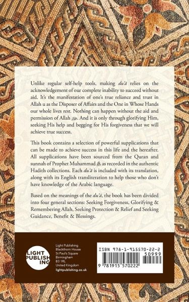 Unlike regular self-help tools, making du'¿ relies on the acknowledgement of our complete inability to succeed without aid. It's the manifestation of one's true reliance and trust in Allah as the Disposer of Affairs and the One in Whose Hands our whole lives rest. Nothing can happen without the aid and permission of Allah. And it is only through glorifying Him, seeking His help and begging for His forgiveness that we will achieve true success. This book contains a selection of powerful supplications that can be made to achieve success in this life and the hereafter. All supplications have been sourced from the Quran and sunnah of Prophet Muhammad s as recorded in the authentic Hadith collections. Each du'¿ is included with its translation, along with its English transliteration to help those who don't have knowledge of the Arabic language. Based on the meanings of the du'¿, the book has been divided into four general sections: Seeking Forgiveness, Glorifying & Remembering Allah, Seeking Protection & Relief and Seeking Guidance, Benefit & Blessings.
