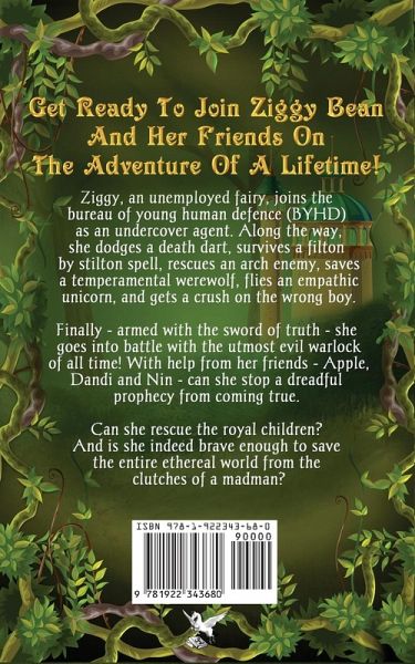 Get ready to Join Ziggy Bean and Her Friends on the Adventure of a Lifetime! Ziggy, an unemployed fairy, joins the bureau of young human defence (BYHD) as an undercover agent. Along the way, she dodges a death dart, survives a filton by stilton spell, rescues and arch enemy, save a temperamental werewolf, flies an empathic unicorn and gets a crush on the wrong boy. Finally, armed with the sword of truth she goes into battle with the utmost evil warlock of all time! With help from her friends - Apple, Dandy and Nin - can she stop a dreadful prophecy from coming true? Can she rescue the royal children? And is she indeed brave enough to save the entire ethereal world from the clutches of a madman?